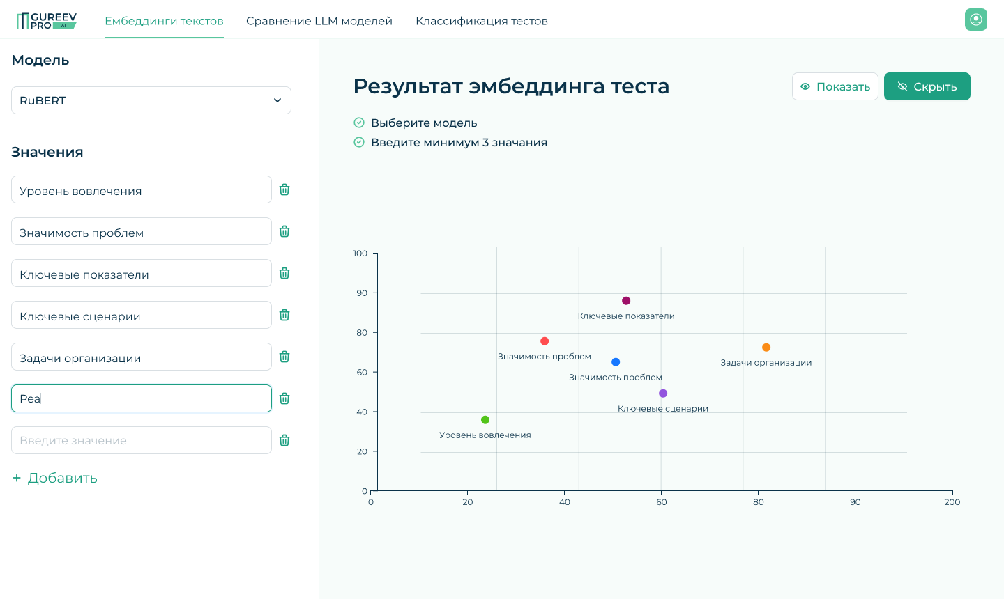Сервис представляет собой набор инструментариев для визуального сравнения различных типов эмбеддингов, сравнения LLM моделей в режиме диалога, тестирования и сравнения классификационных моделей. Подходит для внутреннего тестирования и обучения, обеспечивая глубокое понимание работы с генеративным ИИ и эмбеддингами.